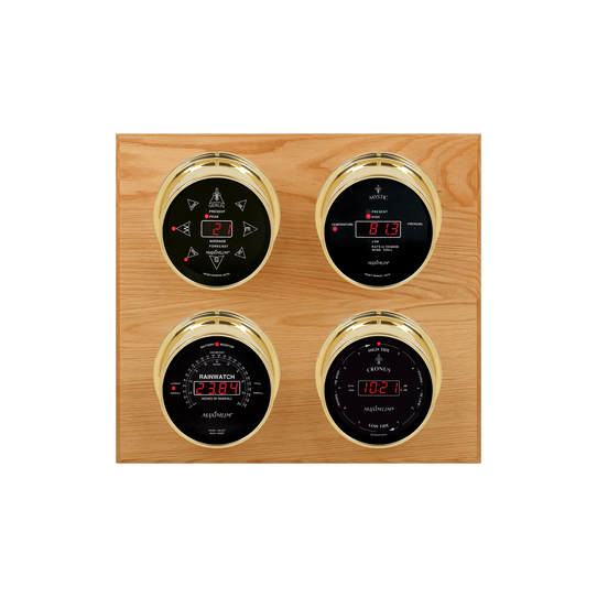The Marconi home weather station is an arrangement of Maximum instruments that provide digital readings for wind speed, wind direction, outside temperature, wind chill, barometric pressure, rainfall, time, and tide. Complete with a 4-instrument mounting panel.